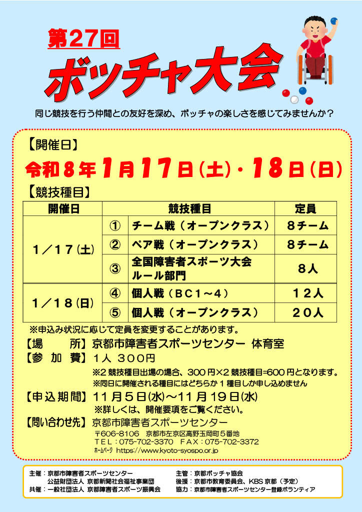 | 主催 | 京都市障害者スポーツセンター 公益財団法人京都新聞社会福祉事業団 |